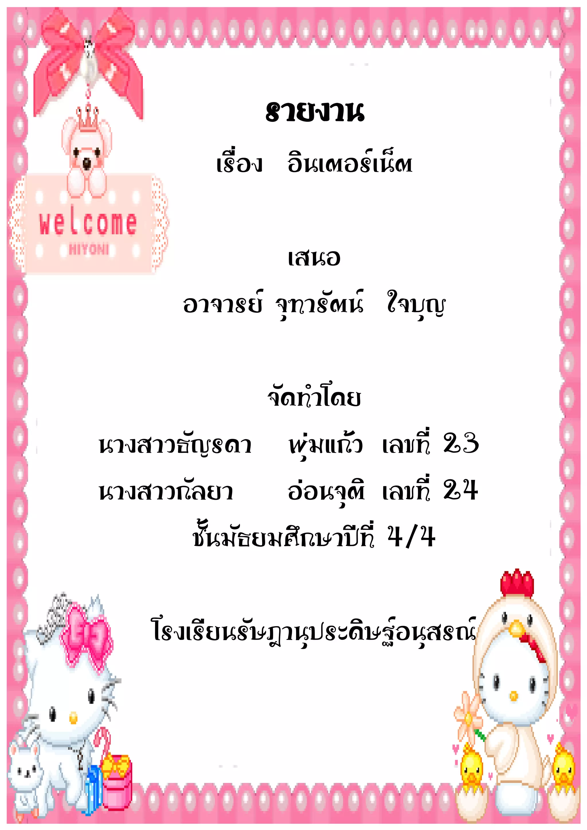 คอมพิวเตอร์ ชั้นมัธยมศึกษา ั ่ ปี ที่ 4 โดยมีจุดประสงค์ เพือศึกษาความรู ้เกี่ยวกับอินเตอร์เน็ต เป็ นการเรี ยนรู ้เพิ่มเติมจากการเรี ยนในชั้น ่ เรี ยน และเป็ นการฝึ กความสามัคคี ผูจดทาหวังเป็ นอย่างยิงว่ารายงานฉบับนี้ จะเป็ นประโยชน์ต่อผูอ่านไม่มากก็น้อย หากผิดพลาด ้ั ้ ่ ประการใด ก็ ขออภัยไว้ ณ โอกาสนี้ดวย ้ จัดทาโดย ่ นางสาวธัญรดา พุมแก้ว นางสาวกัลยา อ่อนจุติ