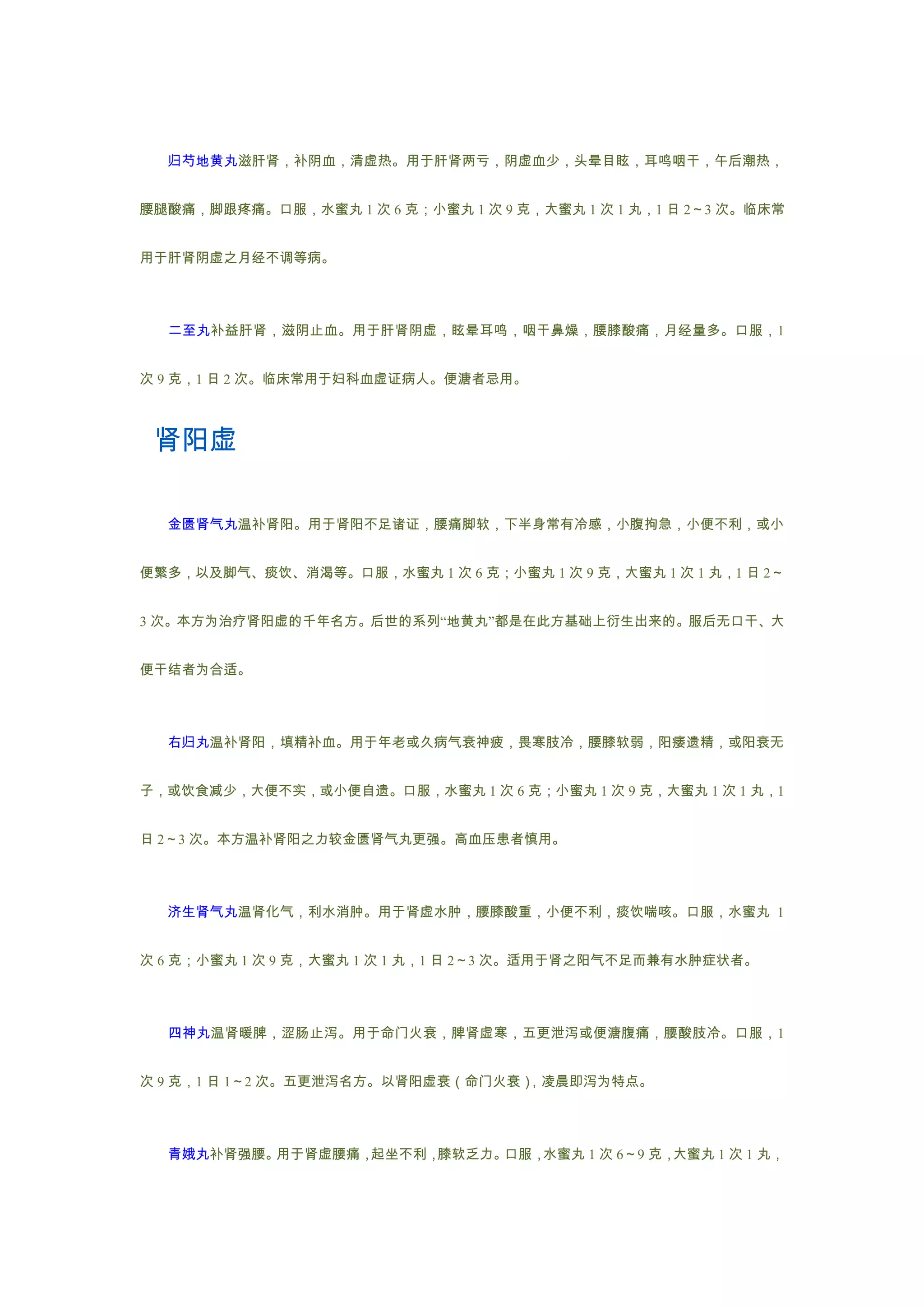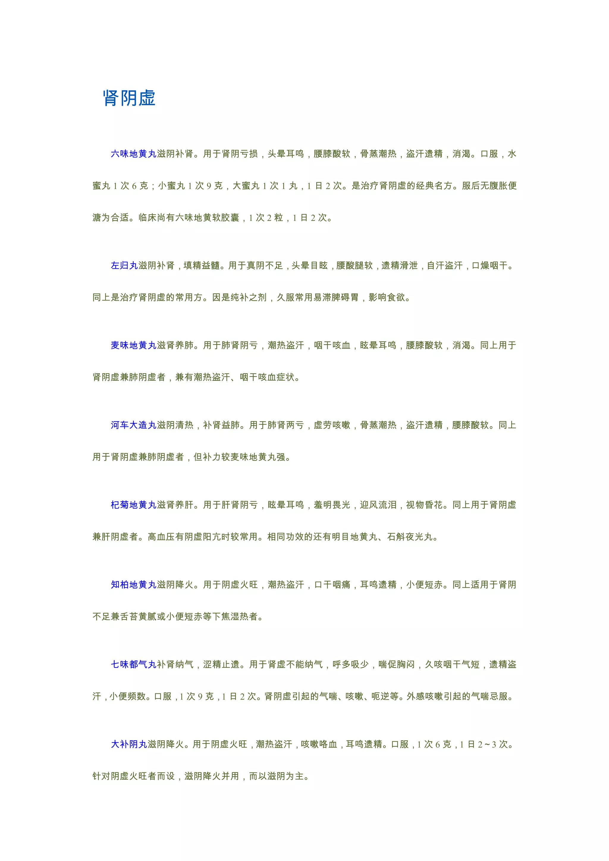 该文档介绍了多种中药方剂,主要用于治疗肾阴虚和肾阳虚相关症状,涵盖了具体的适应症、用法用量以及各方剂的特点。详细描述了如六味地黄丸、金匮肾气丸等经典方剂的作用与适用人群。文档强调了方剂在疗效上的差异及其适用注意事项。