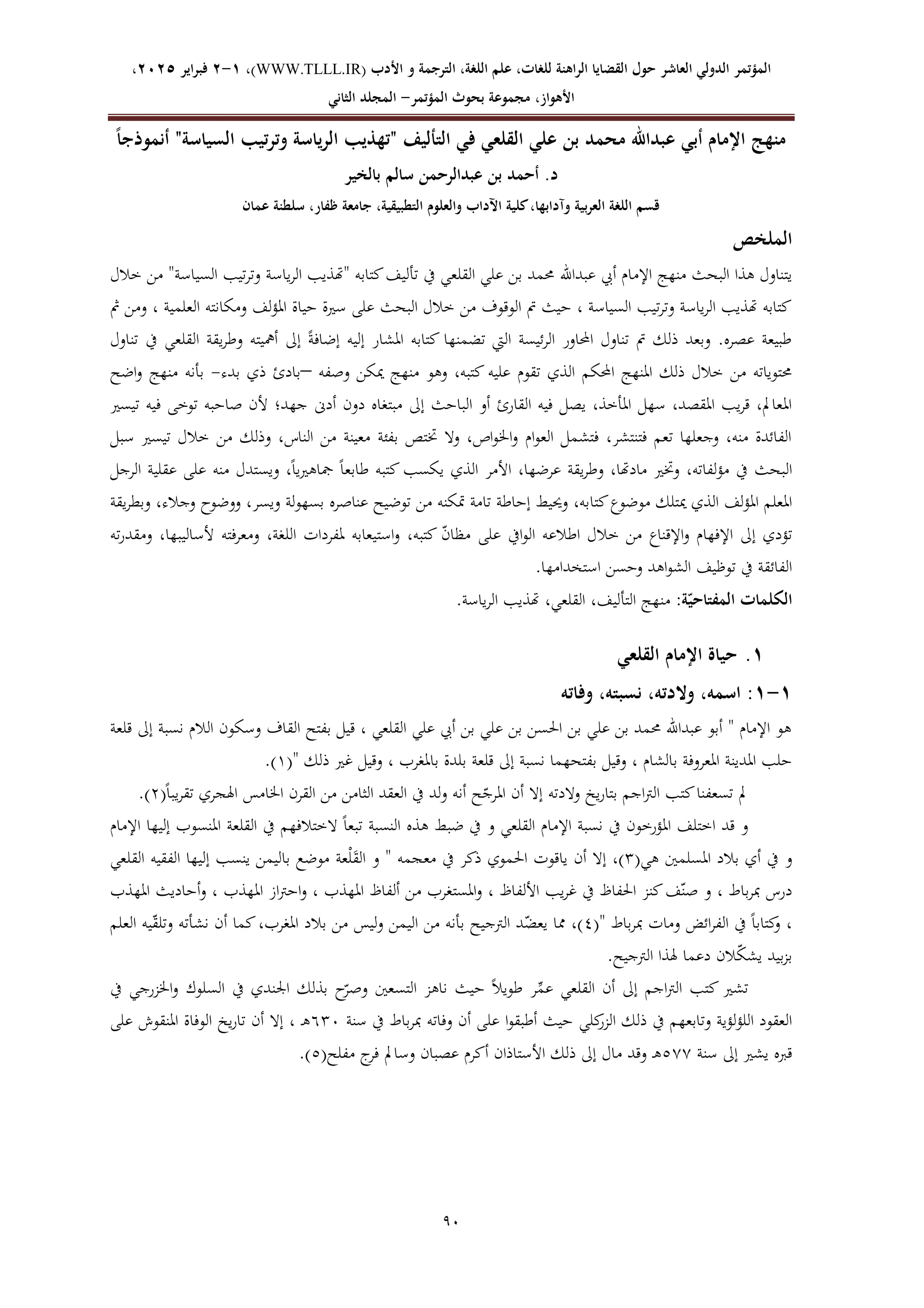 منهج الإمام أبي عبدالله محمد بن علي القلعي في التأليف "تهذيب الرياسة وترتيب السياسة" أنموذجاً