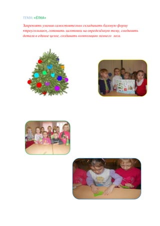 Документ посвящен теме 'ёлка' и акцентирует внимание на умении самостоятельно складывать базовую форму 'треугольник'. В нем обсуждается подготовка заготовок и соединение деталей для создания зимней композиции. Целью является создание целостного изображения зимнего леса.