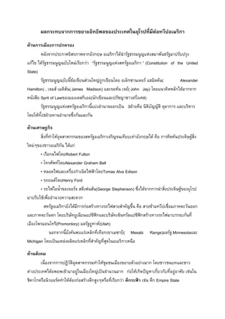 “รัฐธรรมนูญแห่งสหรัฐอเมริกา ” (Constitution of the United State) รัฐธรรมนูญฉบับนี้ข้อเขียนส่วนใหญ่ถูกเขียนโดย อเล็กซานเดอร์ แฮมิลตัน( Alexander Hamilton) , เจมส์ เมดิสัน( James Madison) และจอห์น เจย์( John Jay) โดยแนวคิดหลักได้มากจาก หนังสือ Sprit of Lawของมองเตสกิเออ(นักเขียนและปรัชญาชาวฝรั่งเศส) รัฐธรรมนูญแห่งสหรัฐอเมริกานี้แบ่งอานาจออกเป็น 3ฝ่ายคือ นิติบัญญัติ ตุลาการ และบริหาร โดยให้ทั้ง3ฝ่ายคานอานาจซึ่งกันและกัน ด้านเศรษฐกิจ สิ่งที่ทาให้อุตสาหกรรมของสหรัฐอเมริกาเจริญจนเทียบเท่าอังกฤษได้ คือ การคิดค้นประดิษฐ์สิ่ง ใหม่ๆของชาวอเมริกัน ได้แก่ „ เรือกลไฟโดยRobert Fulton „ โทรศัพท์โดยAlexander Graham Bell „ หลอดไฟและเครื่องกาเนิดไฟฟ้าโดยTomas Alva Edison „ รถยนต์โดยHenry Ford „ รถไฟไอน้าของจอร์จ สตีเฟนสัน(George Stephenson) ซึ่งได้จากการนาสิ่งประดิษฐ์ของยุโรป มาปรับใช้เพื่ออานวยความสะดวก สหรัฐอเมริกายังได้มีการก่อสร้างทางรถไฟสายสาคัญขึ้น คือ สายข้ามทวีปเชื่อมภาคตะวันออก และภาคตะวันตก โดยบริษัทยูเนียนแปซิฟิกและบริษัทเซ็นทรัลแปซิฟิกสร้างทางรถไฟมาบรรจบกันที่ เมืองโพรมอนโทรี(Promontory) มลรัฐยูทาห์(Utah) นอกจากนี้ยังค้นพบแร่เหล็กที่เทือกเขาเมซาบิ( Mesabi Range)มลรัฐ Minnesotaและ Michigan โดยเป็นแหล่งผลิตแร่เหล็กที่สาคัญที่สุดในอเมริกาเหนือ ด้านสังคม เนื่องจากการปฏิวัติอุตสาหกรรมทาให้ชุมชนเมืองขยายตัวอย่างมาก โดยชาวชนบทและชาว ต่างประเทศได้อพยพเข้ามาอยู่ในเมืองใหญ่เป็นจานวนมาก ก่อให้เกิดปัญหาเกี่ยวกับที่อยู่อาศัย เช่นใน ชิคาโกหรือนิวยอร์คทาให้ต้องก่อสร้างตึกสูงๆหรือที่เรียกว่า ตึกระฟ้า เช่น ตึก Empire State