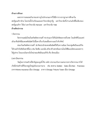 ได้แก่ มหาวิทยาลัย Harvard มหาวิทยาลัย Yale ด้านศิลปกรรม 1.จิตรกรรม จิตรกรรมสมัยใหม่ในคริสต์ศตวรรษที่ 19 ส่วนมากได้รับอิทธิพลจากฝรั่งเศส โดยลัทธิที่เผยแพร่ เข้ามาคือลัทธิอิมเพรสชันนิสต์ มีเนื้อหาเกี่ยวกับชนชั้นกลางและวิวทิวทัศน์ ต่อมาในคริสต์ศตวรรษที่ 20 ศิลปะเอ็กซเพรสชันนิสต์ได้รับความนิยม โดยกลุ่มศิลปินอเมริกัน ได้รวมตัวกับศิลปินชาติอื่นๆ เช่น รัสเซีย เยอรมัน สวิส สร้างสรรค์ผลงานโดยใช้สีแบบอิสระและลดการ ใช้รูปทรง โดยแรงบันดาลใจใหม่ๆของศิลปินอเมริกัน คือ สังคมเมือง 2.สถาปัตยกรรม วัสดุในการก่อสร้างที่สาคัญของยุคนี้ คือ เหล็ก ประกอบกับความสามารถทางวิศวกรรม ทาให้ เกิดสิ่งก่อสร้างมีที่ขนาดสูงใหญ่แข็งแรงมากมาย เช่น สะพาน Golden Gate เมืองSan Francisco อาคารHome insurance เมือง Chicago อาคาร Chicago Tribune Tower เมือง Chicago