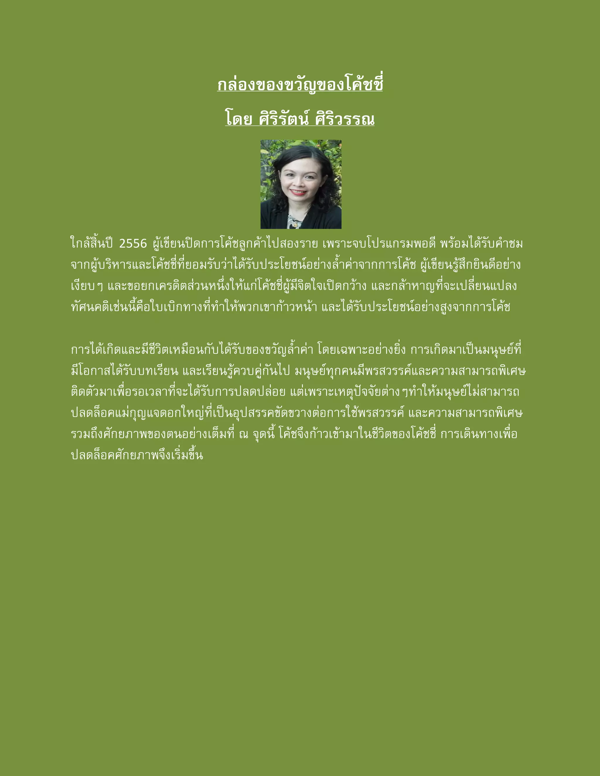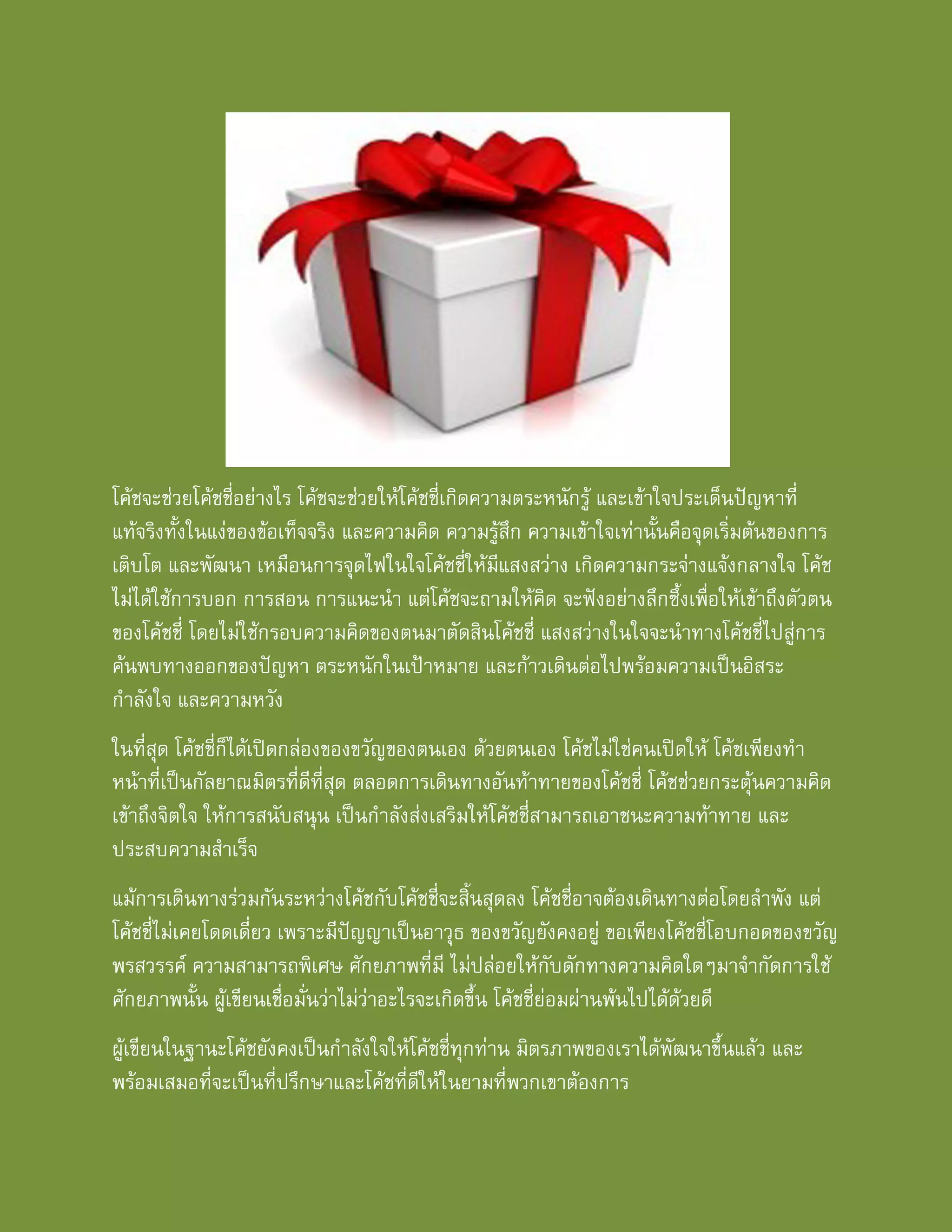 และความคิด ความรูสึก ความเขาใจเทานั้นคือจุดเริ่มตนของการ เติบโต และพัฒนา เหมือนการจุดไฟในใจโคชชี่ใหมีแสงสวาง เกิดความกระจางแจงกลางใจ โคช ไมไดใชการบอก การสอน การแนะนํา แตโคชจะถามใหคิด จะฟงอยางลึกซึ้งเพื่อใหเขาถึงตัวตน ของโคชชี่ โดยไมใชกรอบความคิดของตนมาตัดสินโคชชี่ แสงสวางในใจจะนําทางโคชชี่ไปสูการ คนพบทางออกของปญหา ตระหนักในเปาหมาย และกาวเดินตอไปพรอมความเปนอิสระ กําลังใจ และความหวัง ในที่สุด โคชชี่ก็ไดเปดกลองของขวัญของตนเอง ดวยตนเอง โคชไมใชคนเปดให โคชเพียงทํา หนาที่เปนกัลยาณมิตรที่ดีที่สุด ตลอดการเดินทางอันทาทายของโคชชี่ โคชชวยกระตุนความคิด เขาถึงจิตใจ ใหการสนับสนุน เปนกําลังสงเสริมใหโคชชี่สามารถเอาชนะความทาทาย และ ประสบความสําเร็จ แมการเดินทางรวมกันระหวางโคชกับโคชชี่จะสิ้นสุดลง โคชชี่อาจตองเดินทางตอโดยลําพัง แต โคชชี่ไมเคยโดดเดี่ยว เพราะมีปญญาเปนอาวุธ ของขวัญยังคงอยู ขอเพียงโคชชี่โอบกอดของขวัญ พรสวรรค ความสามารถพิเศษ ศักยภาพที่มี ไมปลอยใหกับดักทางความคิดใดๆมาจํากัดการใช ศักยภาพนั้น ผูเขียนเชื่อมั่นวาไมวาอะไรจะเกิดขึ้น โคชชี่ยอมผานพนไปไดดวยดี ผูเขียนในฐานะโคชยังคงเปนกําลังใจใหโคชชี่ทุกทาน มิตรภาพของเราไดพัฒนาขึ้นแลว และ พรอมเสมอที่จะเปนที่ปรึกษาและโคชที่ดีใหในยามที่พวกเขาตองการ