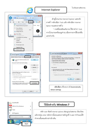 Explorer แสดงดัง ภาพที่ 1 คลิกเลือก Tools แล้ว คลิกเลือก Internet Option จะแสดงภาพที่ 2 * กรณีไม่เหมือนดังภาพ ให้หาคาว่า Tools จากโปรแกรมหรือเมนูต่างๆ เนื่องจากอาจใช้เวอร์ชั่น แตกต่างกัน คลิกเลือก เครื่องหมาย Automatically detect settings วิธีลัดสาหรับ Windows 7 คลิก start พิมพ์ internet options (ช่องรูปแว่นขยาย) เรียบร้อย แล้วกดปุ่ม enter หลังจากนั้นจะแสดงภาพดังรูปที่ 2 และ 3 ด้านบนให้ ทาตามขั้นตอนดังกล่าวข้างต้น Start