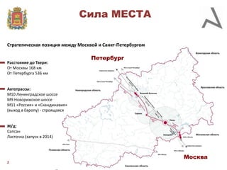 Документ предоставляет комплексный анализ Тверской области, рассматривая ее стратегическое положение, водные ресурсы, социально-экономическое развитие и основные демографические показатели. Обсуждаются программы развития региона, в том числе в сферах транспортной инфраструктуры, туризма и поддержки бизнеса. Включены SWOT-анализы для отдельных городов, таких как Торжок и Вышний Волочёк, выделяющие их сильные и слабые стороны, а также возможности и угрозы.