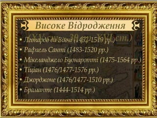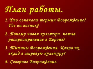 Документ рассматривает эпоху ренессанса как возрождение европейской культуры с акцентом на гуманизм, реализм и интерес к античной культуре. Он обсуждает происхождение термина 'возрождение', его распространение в Европе и вклад ключевых деятелей, таких как Микеланджело в мировую культуру. Также упоминается северное возрождение и развитие новой буржуазной светской культуры.