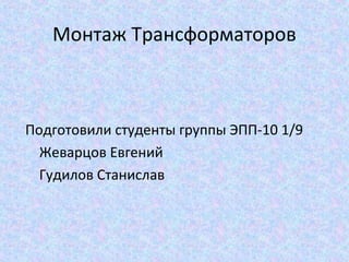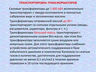 Документ описывает процесс транспортировки, монтажа и хранения трансформаторов, включая требования к их безопасной упаковке и защите от внешних воздействий. Также рассматриваются методы установки трансформаторов и условия, при которых они могут быть успешно внедрены в эксплуатацию. Особое внимание уделяется необходимости контроля состояния трансформаторов при длительном хранении и проверке их герметичности.