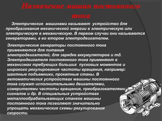 Документ описывает машины постоянного тока, которые преобразуют механическую энергию в электрическую и наоборот, классифицируя их на генераторы и электродвигатели. Он также подробно рассматривает конструкции, режимы работы и принцип действия этих машин, а также различные схемы подключения обмоток возбуждения. В заключение, приводятся типы генераторов постоянного тока, включая магнитоэлектрические и самовозбуждающиеся модели.