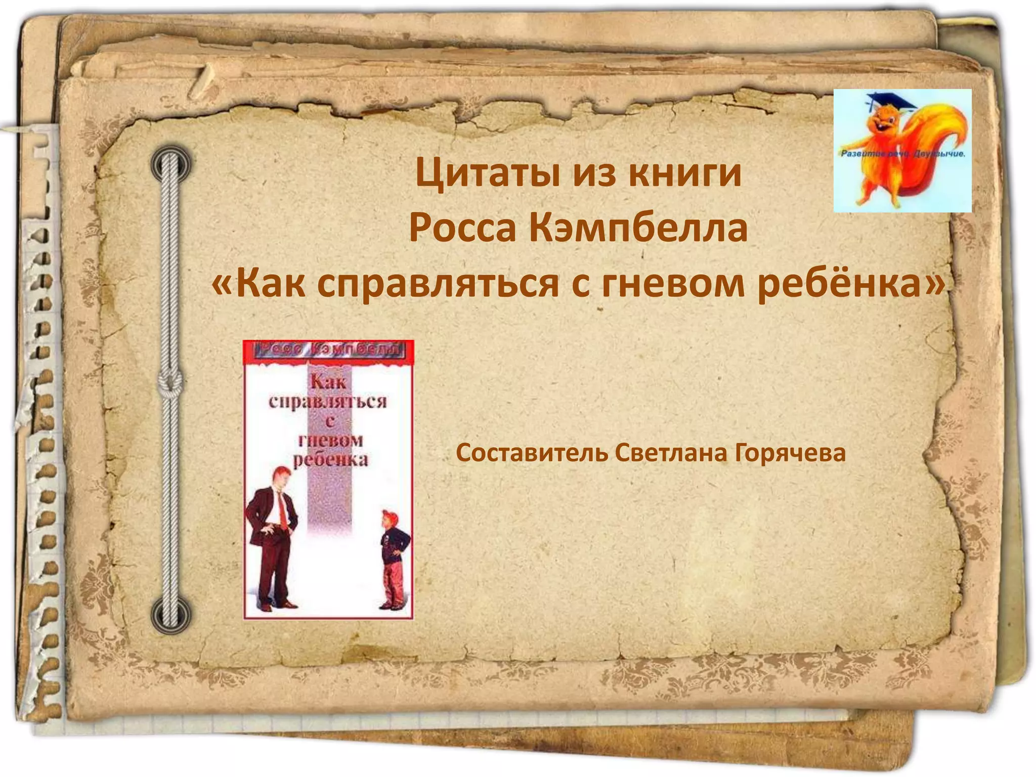 Документ содержит обобщение книги Росса Кэмпбелла «Как справляться с гневом ребёнка», составленное Светланой Горячевой, подчеркивающее важность понимания и управления гневом как родителям, так и детям. Цитаты из книги дают советы по воспитанию детей, обучающим способам выражения гнева и подчеркивают, что недопустимо подавлять эмоции, чтобы избежать формирования пассивно-агрессивного поведения. Также предлагаются методы анализа и разрешения конфликтов между родителями и детьми, способствующие развитию зрелого отношения к гневу.