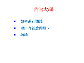 本文件探讨逻辑思维的基础,解释了如何进行有效的论证,包括前提、推论和结论的构成。内容涉及不同类型的推理(演绎和归纳)及常见的推理谬误,例如诉诸权威和二选一谬误。最后,提供了关于如何评估信念和论据是否应被接受的指导。
