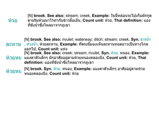 , See also: stream; creek, Example: วันนี้หล่อนจะไปเก็บผักกูดตามริมห้วยมาไว้ทำกับข้าวมื้อเย็น , Count unit: ห้วย , Thai definition: แอ่งที่ขังน้ำซึ่งไหลมาจากภูเขา ห้วย [N] brook , Syn. ห้วย , หนอง , Example: แมงดาตัวเล็กๆ อาศัยอยู่ตามห้วยหนองคลองบึง , Count unit: ห้วย ห้วยหนอง [N] brook , See also: creek; stream; rivulet, Syn. ห้วย , หนอง , Example: แมงดาตัวเล็กๆ มักอาศัยอยู่ตามห้วยหนองคลองบึง , Count unit: ห้วย , Thai definition: แอ่งที่ขังน้ำซึ่งไหลมาจากภูเขา ห้วยหนอง [N] brook , See also: rivulet; waterway; ditch; stream; creek, Syn. ธารน้ำ , ห้วงน้ำ , ห้วยละหาน , Example: ที่ตรงนี้มองเห็นละหานทอดยาวเป็นทางไกลออกไป , Count unit: แห่ง ละหาน