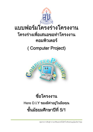 ร โ ง น โครงรางเพื่อเส ขอทํา ง เ สนอข าโครงงาน ง คอม วเต มพิ ตอร ( Computer Project) o e ชือโ ่ โครงงาน ง Here D H D.I.Y ของมีคาอยูในมือคุณ ชั้นมธยมศึกษาปที่ 5/1 ั ม กลุ่มส สาระการเรียนรูการงานอาชีพและเทคโนโลยี โรงเรียนส่วนบุญโญปถัมภ์ ลําพูน ้ก ะ รี ป