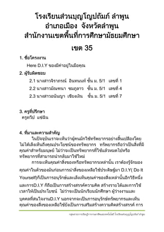 35 1. ชือโครงงาน ่ Here D.I.Y ของมีคาอยูในมือคุณ 2. ผูรบผิดชอบ ั 2.1 นางสาวจิราภรณ อินทนนท ชั้น ม. 5/1 เลขที่ 1 2.2 นางสาวมัณฑนา ชมภูลาว ชัน ม. 5/1 เลขที่ 4 ้ 2.3 นางสาวอนันญา เชียงเงิน ชัน ม. 5/1 เลขที่ 7 ้ 3. ครูทปรึกษา ี่ ครูทวีป แซฉิน 4. ทีมาและความสําคัญ ่ ในปจจุบันเราจะเห็นวาผูคนมักใชทรัพยากรอยางสิ้นเปลืองโดย ไมไดเล็งเห็นถึงคุณประโยชนของทรัพยากร ทรัพยากรถือวาเปนสิ่งที่มี คุณคาสําหรับมนุษย ไมวาจะเปนทรัพยากรทีใชแลวหมดไปหรือ ่ ทรัพยากรที่สามารถนํากลับมาใชใหม การจะเห็นคุณคาสิ่งของหรือทรัพยากรเหลานั้น เราตองรูจักมอง คุณคาในตัวของมันกอนการนําสิ่งของเหลือใชประดิษฐมา D.I.Y( Do It Yourself)ก็เปนการอนุรักษและเล็งเห็นคุณคาของสิ่งเหลานั้นอีกวิธีหนึง ่ และการD.I.Y ก็ถอเปนการสรางสรรคความคิด สรางรายไดและการใช ื เวลาใหเปนประโยชน ไมวาจะเปนนักเรียนนักศึกษา ผูวางงานและ บุคคลที่สนใจงานD.I.Y นอกจากจะเปนการอนุรักษทรัพยากรและเห็น คุณคาของสิ่งของเหลือใชยงเปนการเสริมสรางความคิดสรางสรรค การ ั กลุ่มสาระการเรียนรู้การงานอาชีพและเทคโนโลยี โรงเรียนส่วนบุญโญปถัมภ์ ลําพูน