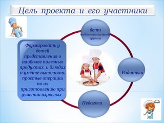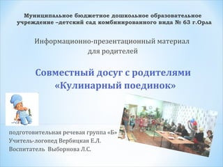 Документ представляет собой информационно-презентационный материал для родителей, посвященный совместному кулинарному досугу с детьми подготовительной группы. Проект направлен на формирование у детей представлений о полезных продуктах и навыков кулинарии с участием родителей и педагогов. В ходе мероприятия проводились различные конкурсы и игры, в которых родители помогали детям, создавая блюда и демонстрируя свои кулинарные умения.