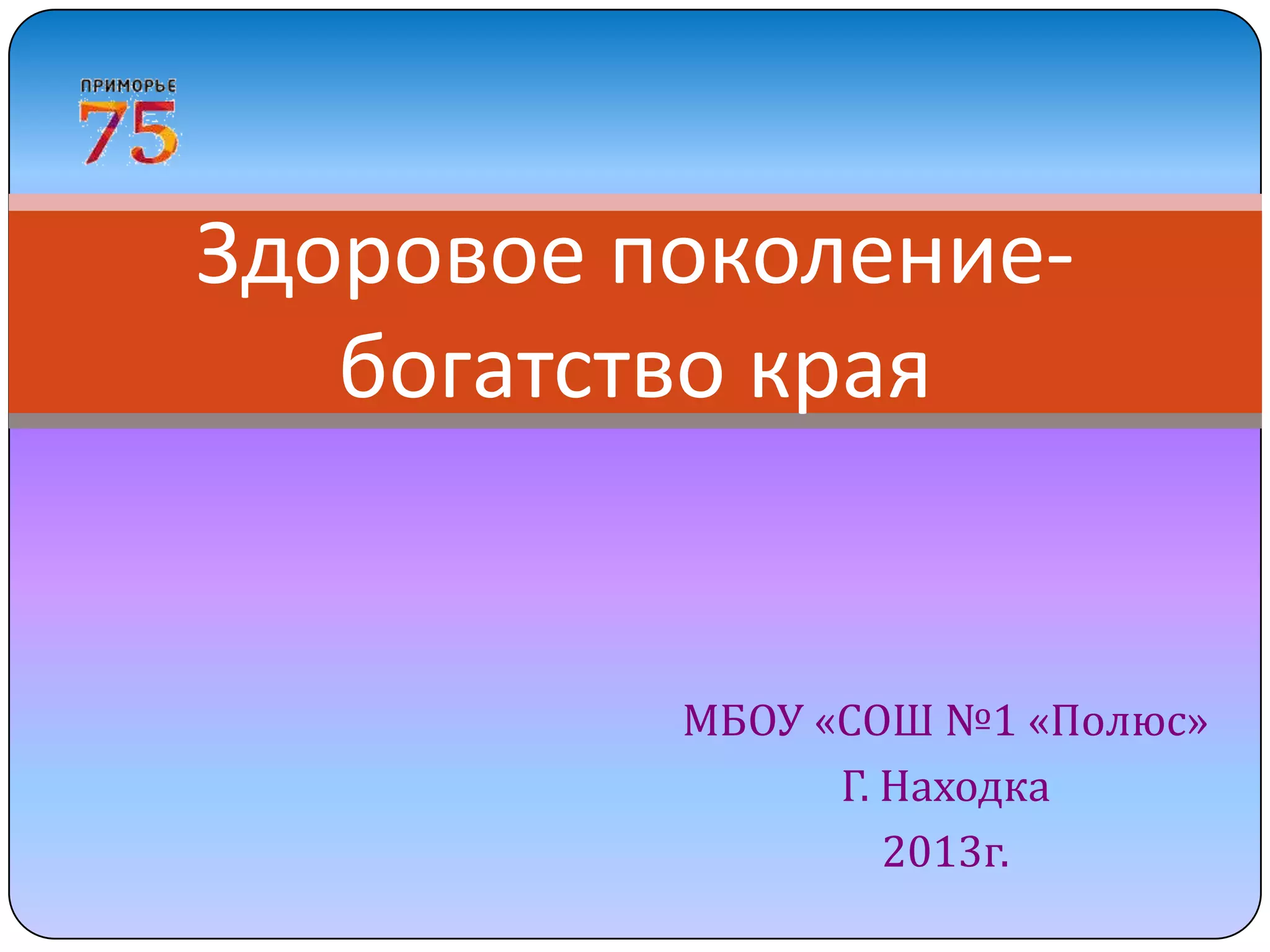 Документ описывает важность здоровья и физической активности для формирования здорового поколения в школе «Полюс» в городе Находка. В нем упомянуты программы по развитию физической культуры и спорта, а также достижения учащихся в различных спортивных секциях. Школа активно пропагандирует здоровый образ жизни и гордится успехами своих чемпионов.