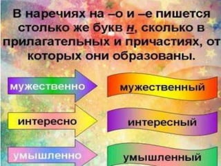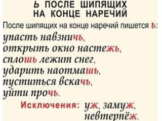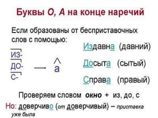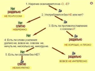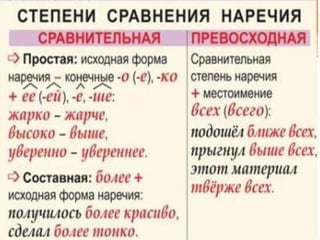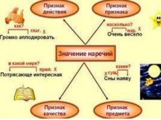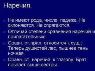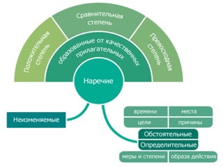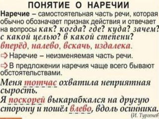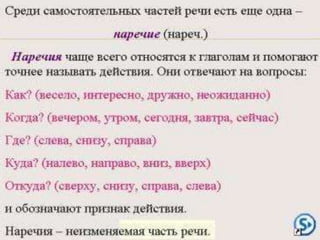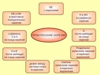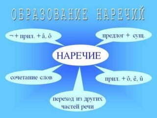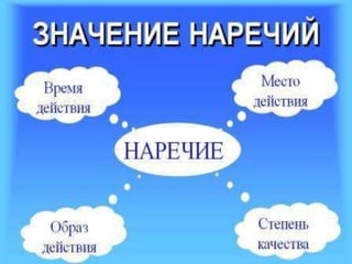 Наречие является самостоятельной частью речи, обозначающей признак действия, предмета или другого признака, и обычно используется как обстоятельство в предложении. Наречия классифицируются по лексическому значению и способу образования, а также могут быть знаменательными или местоименными. Они не изменяются и не согласуются с другими словами, а также подлежат правилам написания, включая употребление дефиса и раздельного написания.