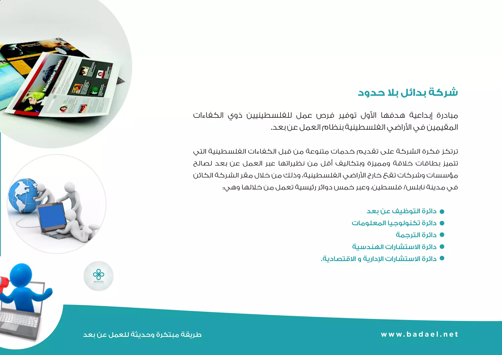 تعمل شركة بدائل على توفير فرص عمل مبتكرة للفلسطينيين من خلال أنظمة العمل عن بعد، وتهدف إلى ربط قوة العمل الفلسطينية مع الشركات حول العالم. تتخصص الشركة في تقديم خدمات متنوعة تشمل الإدارة، الدعم التقني والتسويق، بينما تضمن كفاءة الأداء وحماية المعلومات للموظفين عن بعد. تأسست الشركة عام 2006 وتعتبر رائدة في مجال توفير بدائل العمل الحديثة.
