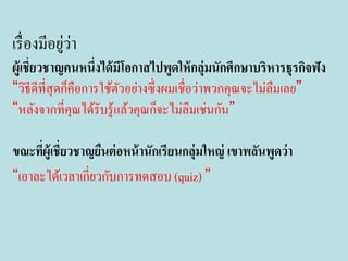 กลุ่มนักศึกษาบริหารธุรกิจฟัง “วิธีดีที่สุดก็คือการใช้ตวอย่างซึ่ งผมเชื่อว่าพวกคุณจะไม่ลืมเลย” ั “หลังจากที่คุณได้รับรู ้แล้วคุณก็จะไม่ลืมเช่นกัน” ขณะทีผู้เชี่ยวชาญยืนต่ อหน้ านักเรียนกลุ่มใหญ่ เขาพลันพูดว่ า ่ “เอาละได้เวลาเกี่ยวกับการทดสอบ (quiz) ”