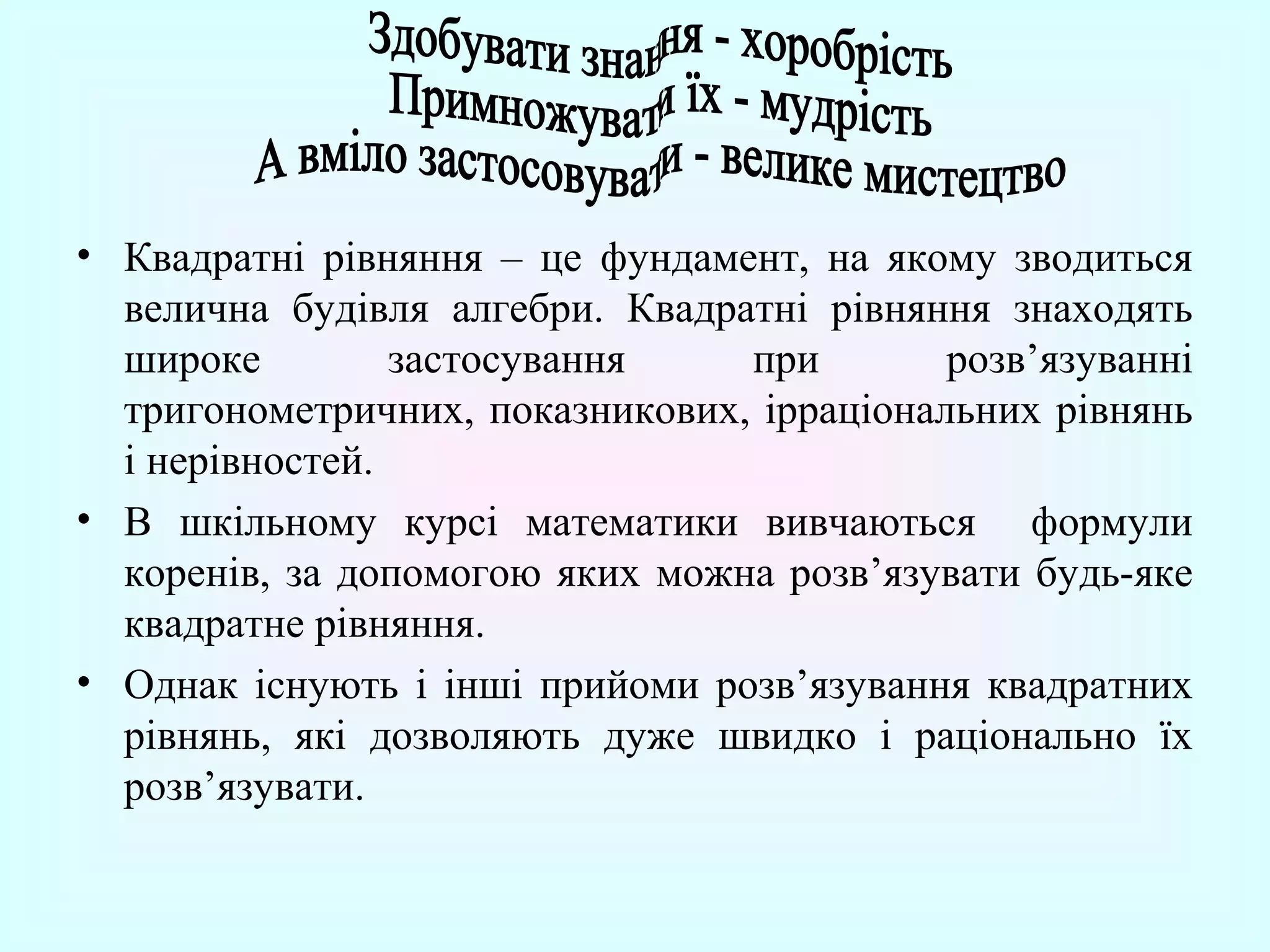 • Квадратні рівняння– це фундамент, на якому зводиться