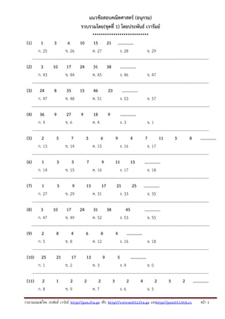 โดยประพันธ์ เวารัมย์ *************************** (1) 1 3 6 10 15 21 ............... ก. 25 ข. 26 ค. 27 ง. 28 จ. 29 --------------------------------------------------------------------------------------------------------------------------------------(2) 3 10 17 24 31 38 ............... ก. 43 ข. 44 ค. 45 ง. 46 จ. 47 --------------------------------------------------------------------------------------------------------------------------------------(3) 24 8 35 15 46 23 ............... ก. 47 ข. 48 ค. 51 ง. 53 จ. 57 ---------------------------------------------------------------------------------------------------------------------------------------(4) 36 9 27 9 18 9 ............... ก. 9 ข. 6 ค. 4 ง. 3 จ. 1 --------------------------------------------------------------------------------------------------------------------------------------(5) 2 5 7 3 6 9 4 7 11 5 8 ............... ก. 13 ข. 14 ค. 15 ง. 16 จ. 17 --------------------------------------------------------------------------------------------------------------------------------------(6) 1 3 5 7 9 11 13 ............... ก. 14 ข. 15 ค. 16 ง. 17 จ. 18 --------------------------------------------------------------------------------------------------------------------------------------(7) 1 5 9 13 17 21 25 ............... ก. 27 ข. 29 ค. 31 ง. 33 จ. 35 --------------------------------------------------------------------------------------------------------------------------------------(8) 3 10 17 24 31 38 45 ............... ก. 47 ข. 49 ค. 52 ง. 53 จ. 55 ---------------------------------------------------------------------------------------------------------------------------------------(9) 2 8 4 6 8 4 ............... ก. 5 ข. 8 ค. 12 ง. 16 จ. 18 --------------------------------------------------------------------------------------------------------------------------------------(10) 25 21 17 13 9 5 ............... ก. 1 ข. 2 ค. 3 ง. 4 จ. 0 --------------------------------------------------------------------------------------------------------------------------------------(11) 2 1 2 2 2 3 2 4 2 5 2 ............... ก. 8 ข. 9 ค. 7 ง. 6 จ. 5 รวบรวมเผยแพรโดย ประพันธ เวารัมย http://pun.fix.gs หรือ http://valrom2012.fix.gs และhttp://pun2013.bth.cc หนา 1