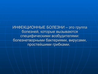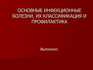 Документ описывает основы инфекции и инфекционные болезни, охватывая их причины, классификацию и методы профилактики. Основное внимание уделяется взаимодействию болезнетворных возбудителей с организмом человека и мерам по повышению иммунитета. Профилактика включает как оздоровительные мероприятия, так и иммунизацию для защиты от инфекционных заболеваний.