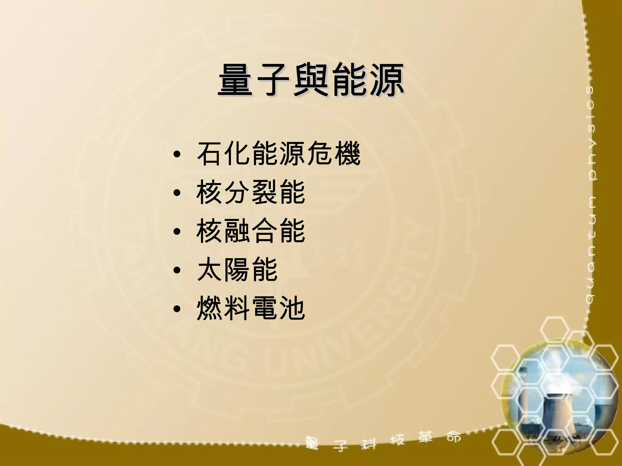 本文探讨了能源危机的背景以及多种替代能源的潜力,包括核分裂能、核融合能、太阳能和燃料电池。核能具有较高的能量密度且核融合被认为比核分裂更安全环保,而太阳能和燃料电池等新型能源则展示了良好的发展前景与应用潜力。整体而言,文档强调了开发可持续能源以应对日益严重的石化能源危机的重要性。