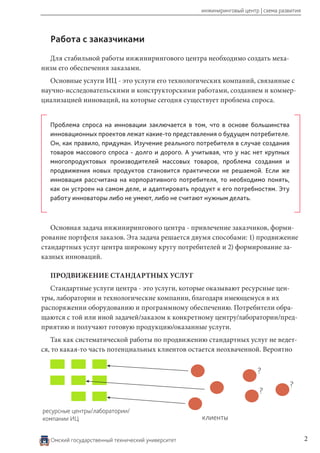 Документ представляет собой стратегический план развития инжинирингового центра Омского государственного технического университета, который включает четыре основных направления: работа с заказчиками и клиентами, развитие инфраструктуры, подготовка студентов и управление проектами. Основное внимание уделяется проблеме спроса на инновации и необходимости адаптации предложений под реальные потребности заказчиков, а также формированию механизмов привлечения и обслуживания клиентов. Кроме того, документ подчеркивает важность развития 'мягкой' инфраструктуры, включая создание инновационной среды и поддержание коммуникаций между участниками экосистемы.