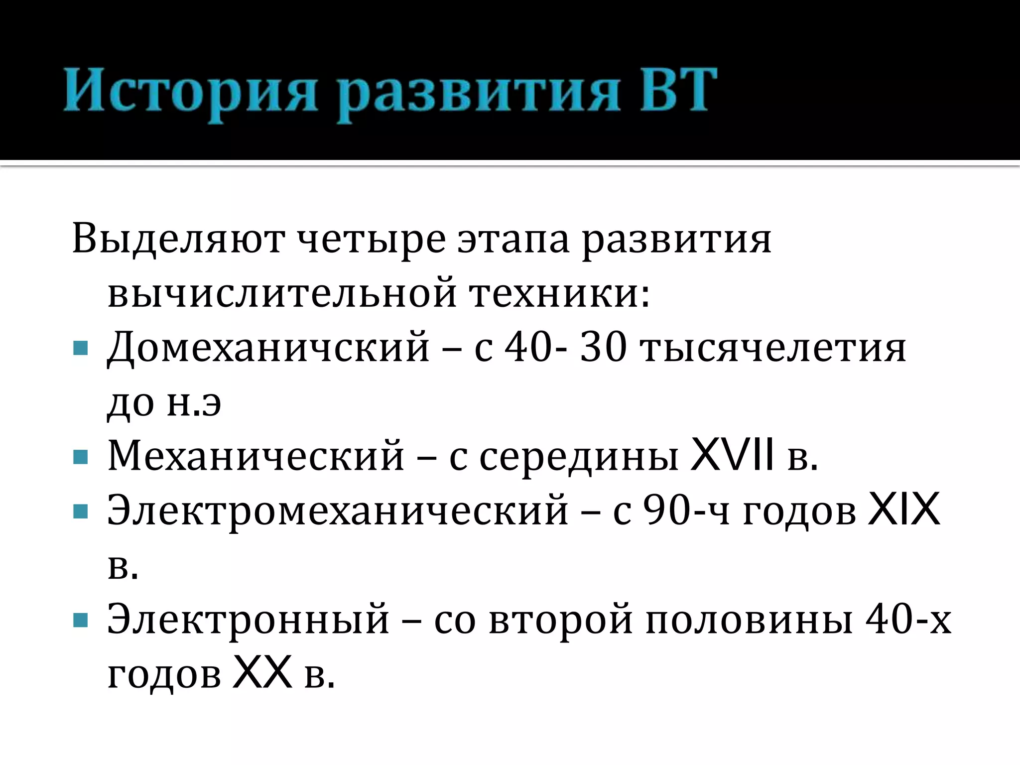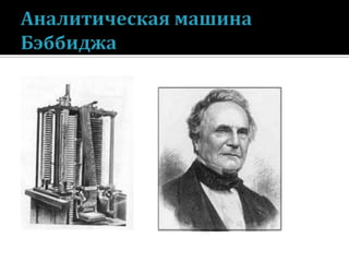 Документ описывает четыре этапа развития вычислительной техники: домеханический, механический, электромеханический и электронный. Каждый этап характеризуется определенными технологическими достижениями и применением различных элементных баз для решения научно-технических задач. Современные машины, основанные на полупроводниковых приборах, предназначены для выполнения сложных задач и управления производственными процессами.