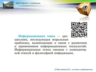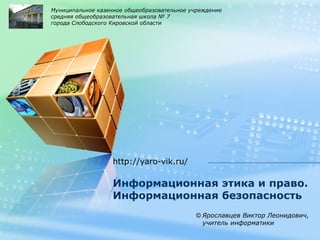Документ представляет собой информацию о муниципальном казенном общеобразовательном учреждении средней общеобразовательной школе номер 7 города Слободского, Кировская область, с упоминанием учителя информатики Виктора Леонидовича Ярославцева. Основное внимание уделяется теме информационной этики и права, а также вопросам информационной безопасности.