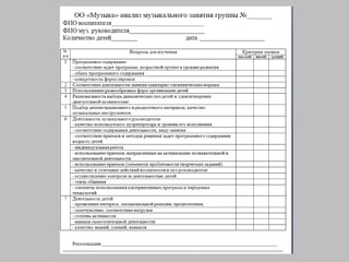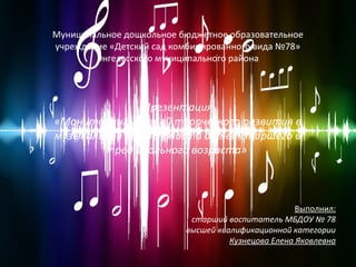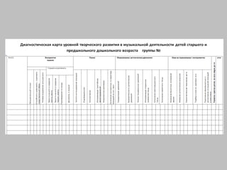 Документ представляет собой презентацию о мониторинге творческого развития детей в музыкальной деятельности в дошкольном учреждении. Основная цель исследования заключается в выявлении особенностей развития и эффективности педагогической деятельности, а также в сравнении уровней творческого развития по различным программам. Результаты диагностики показывают стабильную положительную динамику в экспериментальной группе по сравнению с контрольной.