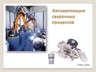 Документ описывает применение автоматизации и роботизированного оборудования в сварочном производстве, направленное на повышение производительности, улучшение качества и снижение затрат. Автоматизация включает использование сварочных автоматов, манипуляторов и роботов, которые заменяют традиционную рабочую силу и требуют высокой квалификации для настройки процессов. Также рассматриваются различные технологии сварки и оборудование, необходимое для механизации процесса.