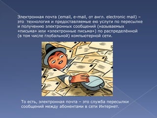 Электронная почта представляет собой технологию для пересылки и получения сообщений через сеть Интернет, начиная с 1965 года. Она использует протоколы, такие как SMTP для отправки и POP3 или IMAP для получения, а также позволяет пользователям работать через почтовые клиенты или браузеры. Электронная почта имеет свои преимущества, такие как скорость и возможность прикрепления файлов, но также сталкивается с проблемами, включая спам и ограничения на размер сообщений.