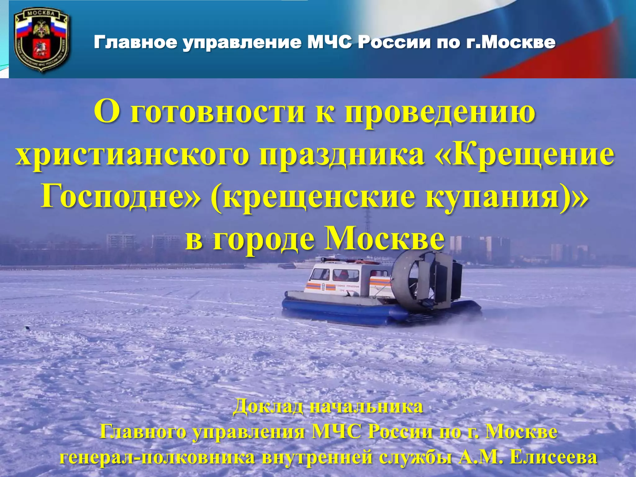 В Москве 18 и 19 января 2014 года планируются мероприятия по празднованию Крещения Господня с участием около 120 тысяч человек и подготовленными 54 местами для крещенских купаний. МЧС обеспечит безопасность на мероприятиях с использованием 709 спасателей, 980 полицейских и 60 бригад скорой помощи, а также необходимыми условиями для участников. Основной задачей является предотвращение массового выхода людей на недостаточно прочный лед толщиной менее 25 см.