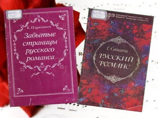 Документ представляет собой виртуальную выставку, посвященную русскому романсу, подчеркивающую его значимость в отечественной музыкальной культуре. Рассматриваются творения известных композиторов, таких как Глинка, Даргомыжский и Чайковский, а также их влияние на развитие жанра. Романсы первой половины XIX века раскрывают темы любви и человеческих чувств, сочетая народные традиции с европейскими музыкальными влияниями.