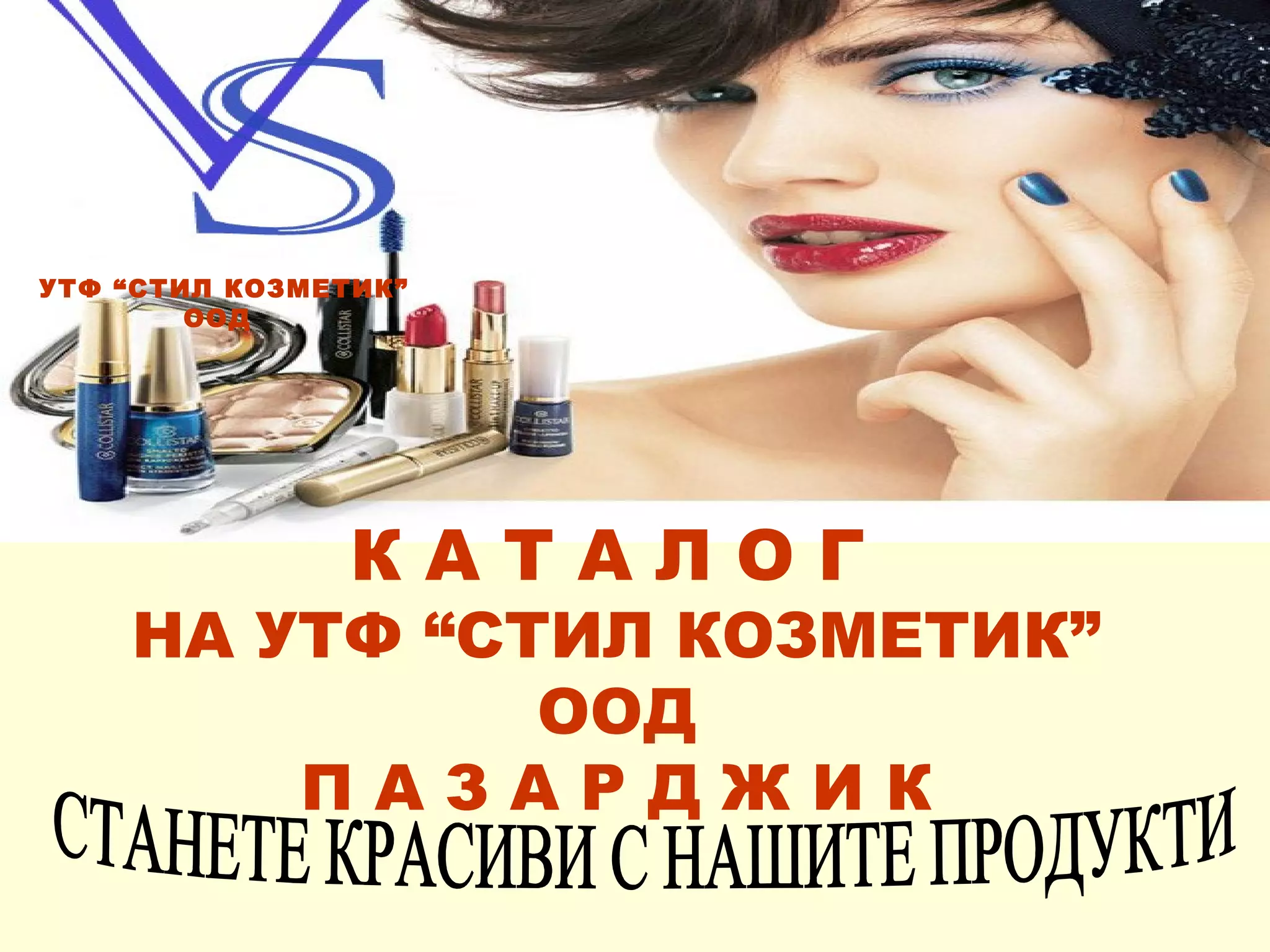 Документ представляет собой каталог косметических продуктов компании 'Стил Козметик' из Пазарджика, предлагающий широкий ассортимент товаров, включая помады, лак для ногтей, пудры и парфюмерию по доступным ценам. В каталоге указаны цены на каждый продукт, а также советы по выбору косметики и парфюмов в зависимости от стиля клиента. Также представлены контактные данные компании для дальнейших покупок.
