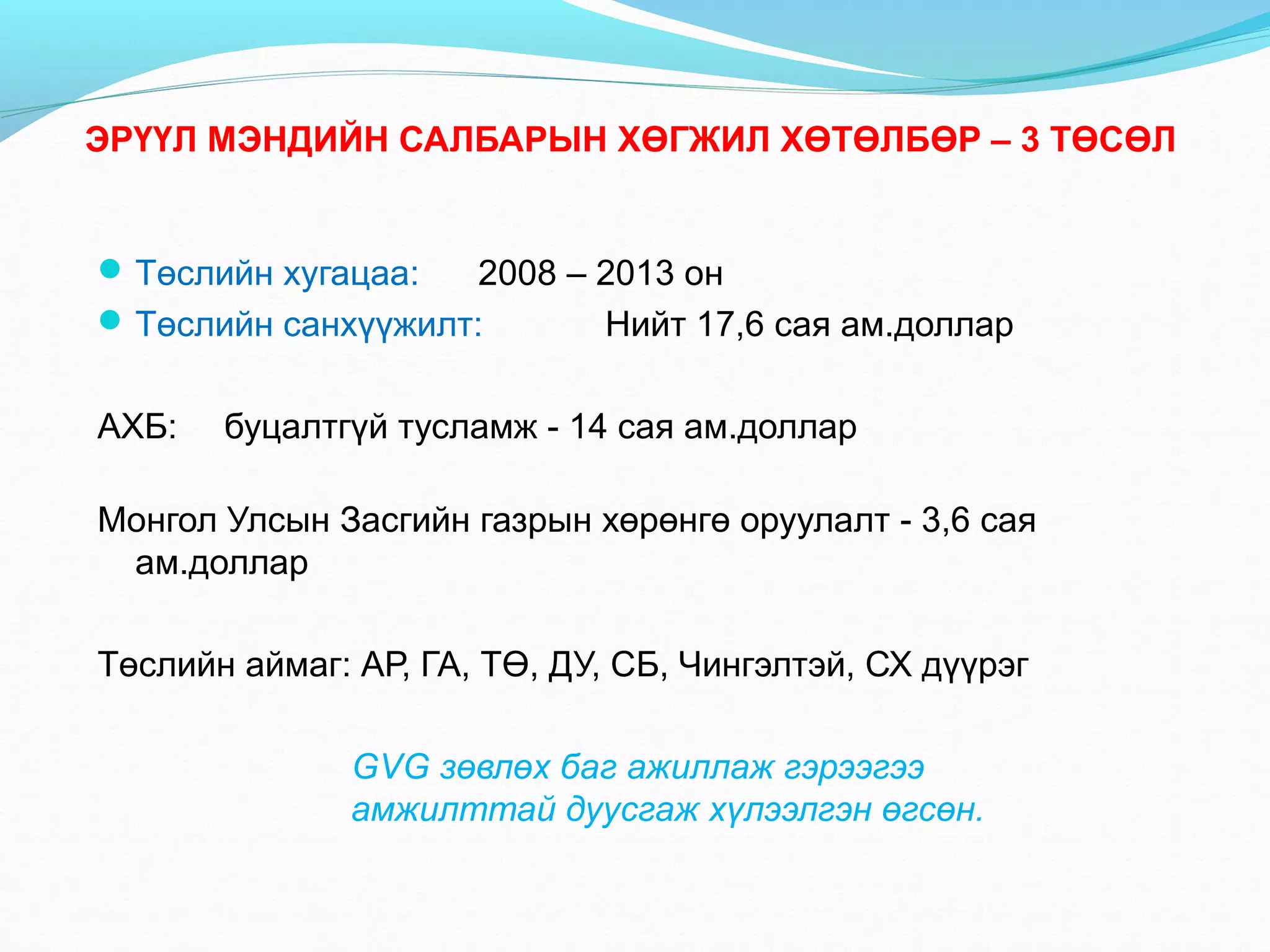 ЭРҮҮЛ МЭНДИЙН САЛБАРЫНХӨГЖИЛ ХӨТӨЛБӨР – 3 ТӨСӨЛ