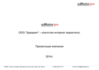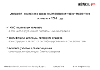 ООО 'Эдмаркет' – агентство интернет-маркетинга, основанное в 2009 году, предоставляет комплексные услуги, в том числе контекстную и таргетированную рекламу, и веб-аналитику. Компания обслуживает более 100 клиентов и предлагает низкие цены за клик, а также индивидуальный подход и профессиональный сервис. В документе также представлены успешные кейсы и отзывы клиентов о проведенных рекламных кампаниях.