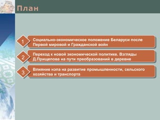 Документ охватывает социально-экономическое положение Беларуси после Первой мировой и гражданской войн, переход к новой экономической политике (нэп) и влияние этой политики на деревню. В результате войны экономика страны сильно пострадала, что привело к необходимости кардинальных реформ, таких как замена военного коммунизма на нэп, направленный на восстановление хозяйственных связей и товарно-денежных отношений. Основные положения нэпа включали разрешение частной собственности, переход к продналогу и введение властных структур для поддержки сельского хозяйства и промышленности.