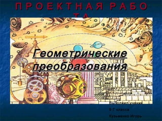 Документ представляет собой проектную работу ученика 9-го класса, посвященную геометрическим преобразованиям плоскости. В работе описаны основные виды преобразований, такие как движения, подобие и гомотетия, с объяснением их свойств и применения. Особое внимание уделяется аффинным преобразованиям и их значению в математической культуре.