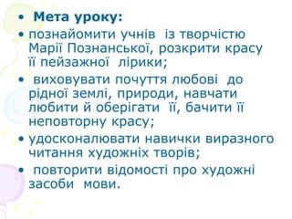 Мета уроку: познайомити учнів із творчістю Марії Познанської, розкрити красу її пейзажної лірики; виховувати почуття любові до рідної землі, природи, навчати любити й оберігати її, бачити її неповторну красу; удосконалювати навички виразного читання художніх творів; повторити відомості про художні засоби мови.