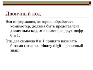 Документ описывает процесс кодирования информации в компьютерах, включая двоичный код и различные системы счисления, такие как позиционные и непозиционные. Он охватывает аспекты кодирования текстовой, графической и звуковой информации, объясняя, как они представляются в двоичной форме и соответствующих кодировках, например ASCII и Unicode. Обсуждаются также отличия между растровыми и векторными изображениями, а также принципы их кодирования.