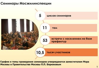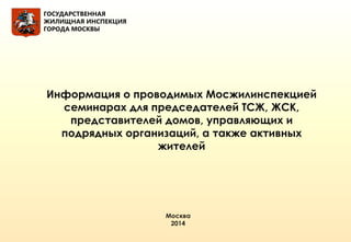 Документ содержит информацию о семинарах, проводимых государственным жилищным инспекцией Москвы для представителей ТСЖ, ЖСК и активных жителей в 2014 году. Основные темы семинаров включают контроль за деятельностью ТСЖ, капитальный ремонт и начисление платы за жилищно-коммунальные услуги. Целью мероприятий является повышение уровня знаний собственников и оперативное решение вопросов, возникающих у участников семинаров.