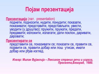 Појам презентација Презентација (лат. presentation) поднети, подносити, нудити, понудити; показати, показивати; представити, представљати, увести, уводити (у друштво); пружити, пружати, предати, предавати; изложити, излагати; дати поклон, даривати, даровати; Презентирати се представити се, показивати се; показати се, правити се, појавити се, правити добар или лош утисак, имати добар или рђав изглед. Извор: Милан Вујаклија – Лексикон страних речи и израза, Просвета,Београд, 1980.
