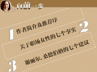 谢丽尔·桑德伯格在书中探讨了职场女性面临的挑战,如晋升机会、性别比例和家庭分工等,并提供了针对女性的职场建议,包括积极参与和设定目标。她强调女性需要在职场上更自信和主动,以改变传统观念,创造更多选择。文中引用了一系列统计数据和研究报告, highlighting女性在职场中的现实问题。