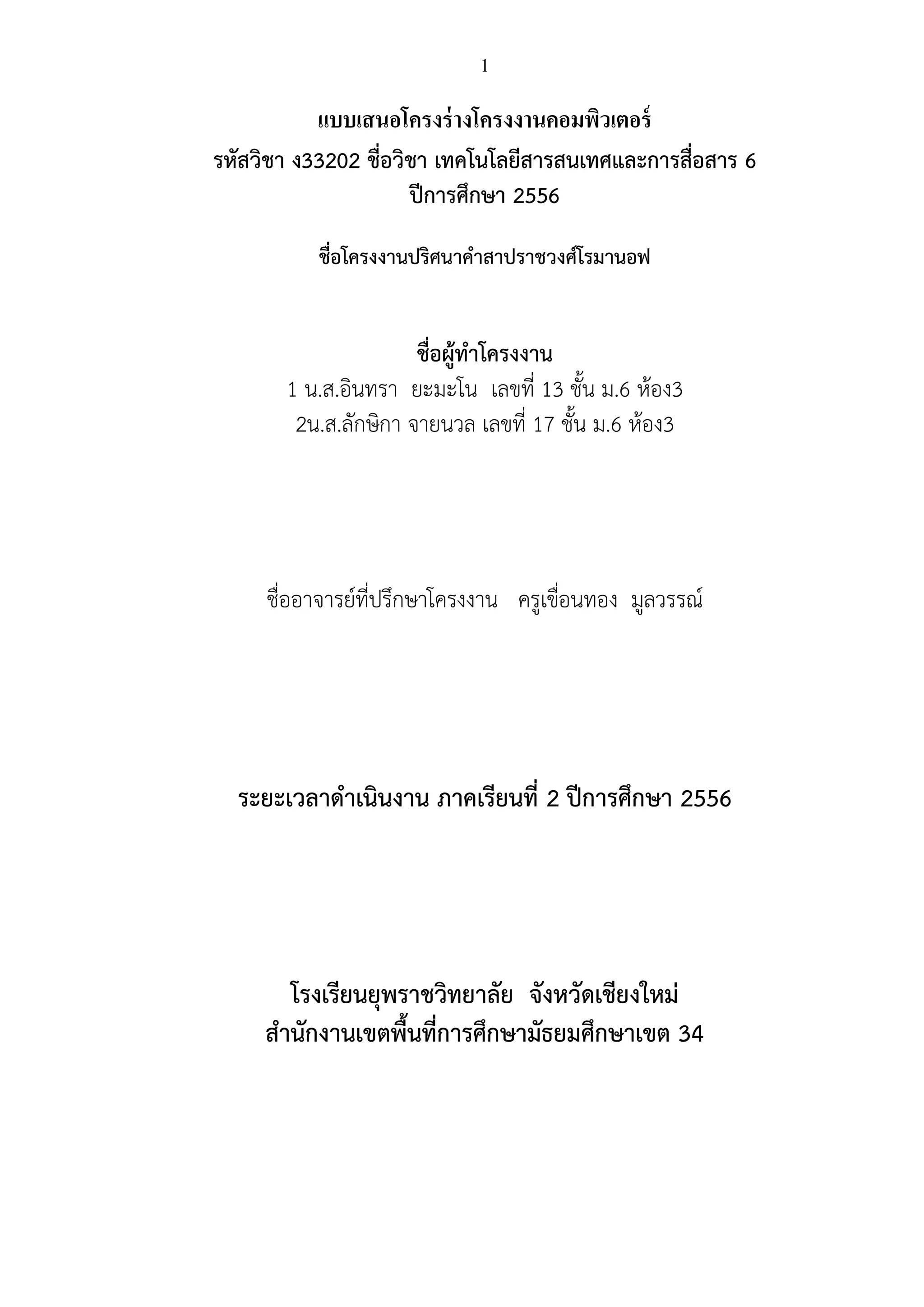 ชื่อวิชา เทคโนโลยีสารสนเทศและการสื่อสาร 6 ปีการศึกษา 2556 ชื่อโครงงานปริศนาคาสาปราชวงศ์โรมานอฟ ชื่อผู้ทาโครงงาน 1 น.ส.อินทรา ยะมะโน เลขที่ 13 ชั้น ม.6 ห้อง3 2น.ส.ลักษิกา จายนวล เลขที่ 17 ชั้น ม.6 ห้อง3 ชื่ออาจารย์ที่ปรึกษาโครงงาน ครูเขือนทอง มูลวรรณ์ ่ ระยะเวลาดาเนินงาน ภาคเรียนที่ 2 ปีการศึกษา 2556 โรงเรียนยุพราชวิทยาลัย จังหวัดเชียงใหม่ สานักงานเขตพื้นที่การศึกษามัธยมศึกษาเขต 34