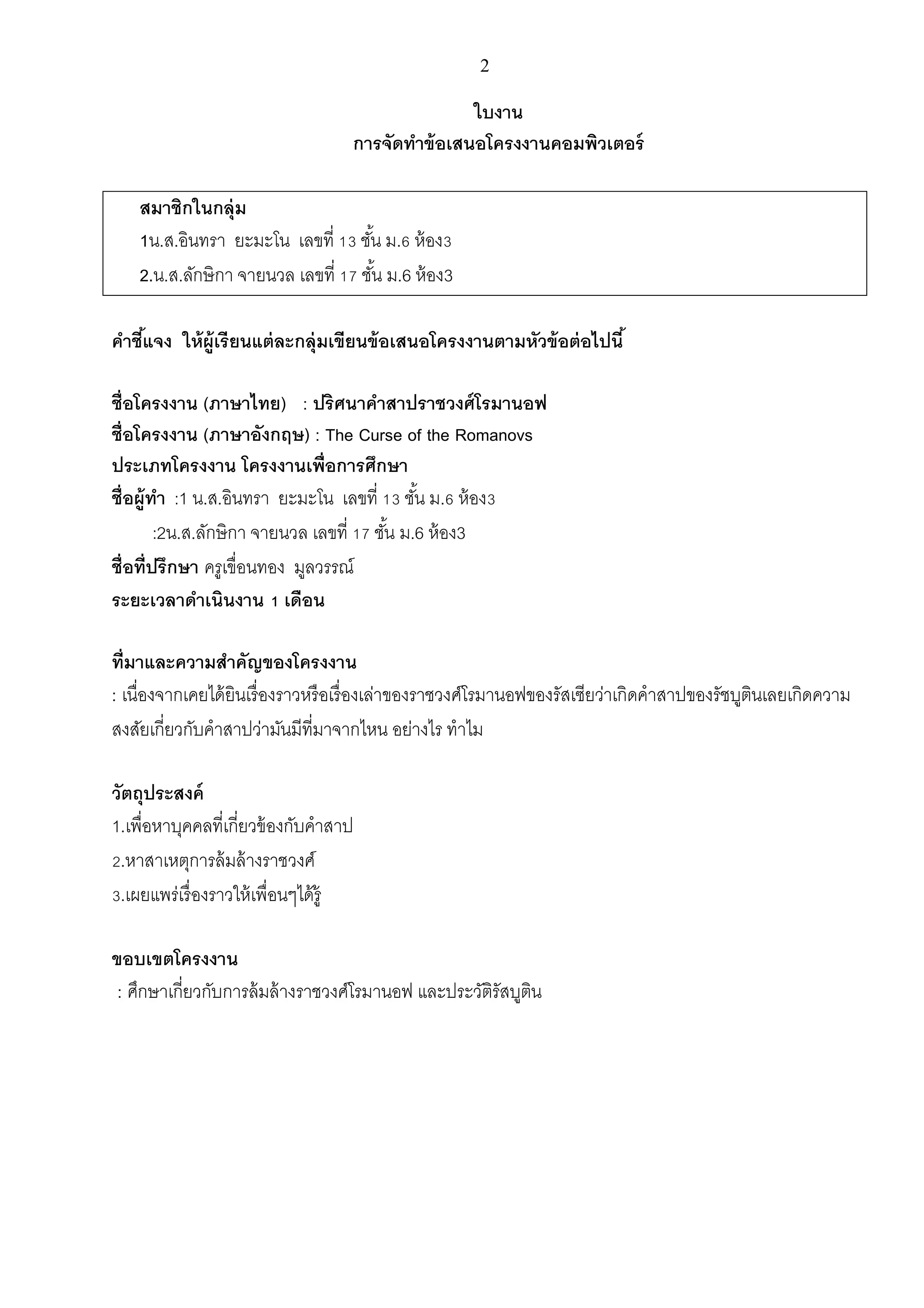 เลขที่ 13 ชัน ม.6 ห้ อง3 ้ 2.น.ส.ลักษิกา จายนวล เลขที่ 17 ชัน ม.6 ห้ อง3 ้ คาชีแจง ให้ ผ้ ูเรี ยนแต่ ละกลุ่มเขียนข้ อเสนอโครงงานตามหัวข้ อต่ อไปนี ้ ้ ชื่อโครงงาน (ภาษาไทย) : ปริศนาคาสาปราชวงศ์ โรมานอฟ ชื่อโครงงาน (ภาษาอังกฤษ) : The Curse of the Romanovs ประเภทโครงงาน โครงงานเพื่อการศึกษา ชื่อผู้ทา :1 น.ส.อินทรา ยะมะโน เลขที่ 13 ชัน ม.6 ห้ อง3 ้ :2น.ส.ลักษิกา จายนวล เลขที่ 17 ชัน ม.6 ห้ อง3 ้ ชื่อที่ปรึกษา ครูเขื่อนทอง มูลวรรณ์ ระยะเวลาดาเนินงาน 1 เดือน ที่มาและความสาคัญของโครงงาน : เนื่องจากเคยได้ ยินเรื่ องราวหรื อเรื่ องเล่าของราชวงศ์โรมานอฟของรัสเซียว่าเกิดคาสาปของรัชบูตนเลยเกิดความ ิ สงสัยเกี่ยวกับคาสาปว่ามันมีที่มาจากไหน อย่างไร ทาไม วัตถุประสงค์ 1.เพื่อหาบุคคลที่เกี่ยวข้ องกับคาสาป 2.หาสาเหตุการล้ มล้ างราชวงศ์ 3.เผยแพร่เรื่ องราวให้ เพื่อนๆได้ ร้ ู ขอบเขตโครงงาน : ศึกษาเกี่ยวกับการล้ มล้ างราชวงศ์โรมานอฟ และประวัตรัสบูตน ิ ิ