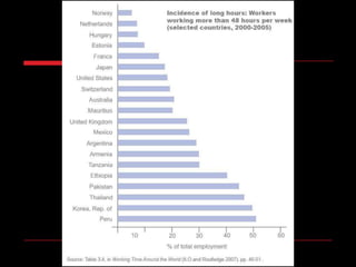 노동시간. OECD(경제개발협력기구) 자료에따르면 2005년 기준으로 우리나라 노동자들 연간 노동시간은 2354시간으로 비교 대상 나라들 가운데 가장 길었다. 노르웨이는 연간 1360시간, 독일은 1435시간, 프랑스는 1535시간, 스웨덴은 1587시간으로 나타났다.