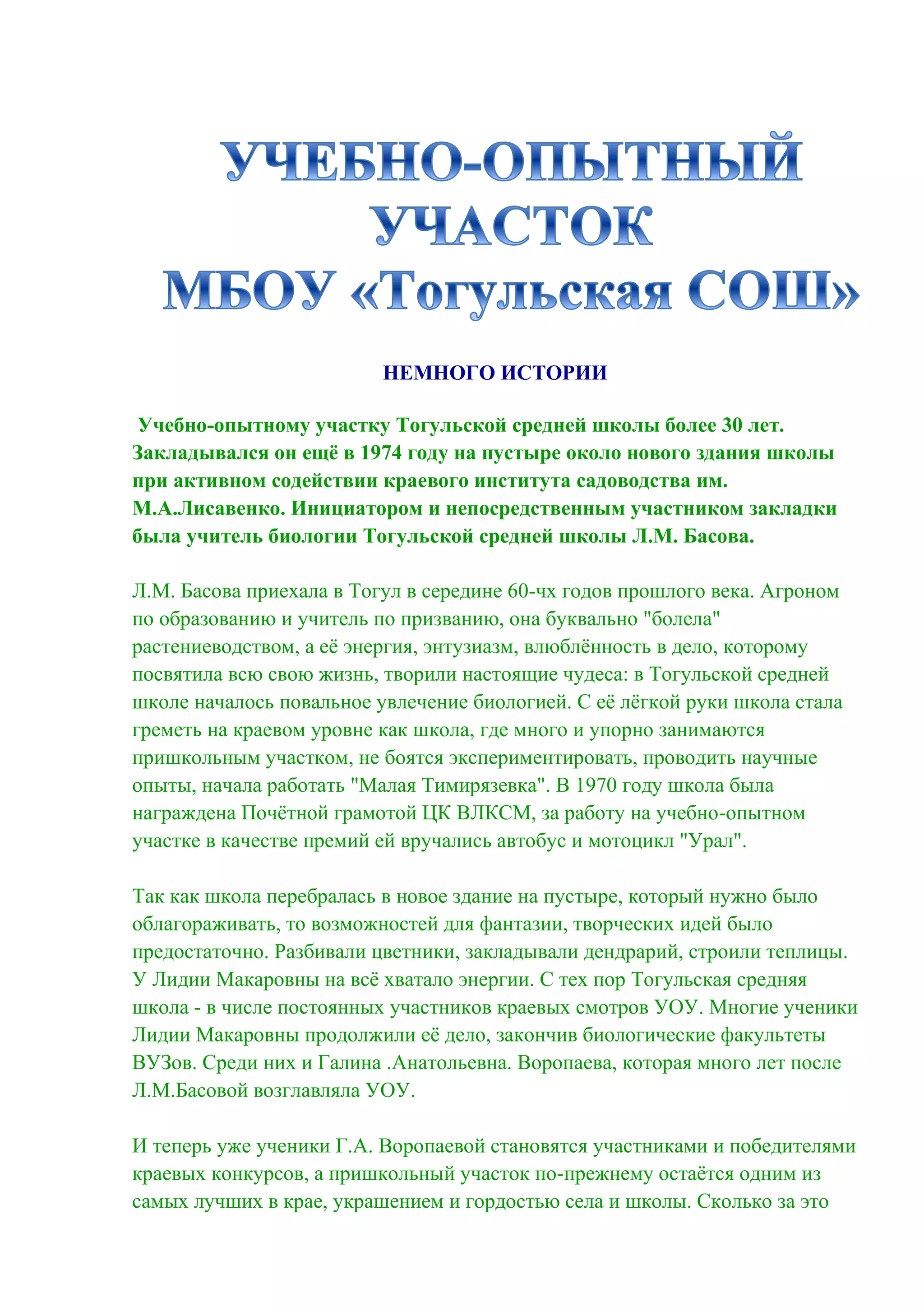 Учебно-опытный участок тогульской средней школы существует более 30 лет, начиная с 1974 года, и был инициирован учителем биологии Л.М. Басовой. Участок стал платформой для обучения биологии и сельскому хозяйству, где студенты получают практические навыки, участвуют в конкурсах и достигают значительных успехов, что делает его гордостью школы и села. В настоящее время участок управляется ученицей, последовавшей по стопам своих предшественников, и продолжает сохранять высокие стандарты и традиции экологического образования.