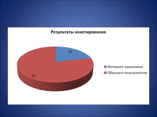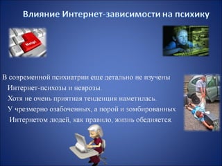 Документ обсуждает влияние интернета на молодежь и проблемы, связанные с интернет-зависимостью, включая изменения в работе мозга и психологические последствия. Исследования показывают, что каждый третий ребенок страдает от интернет-зависимости, влияющей на эмоциональное состояние и социальную жизнь. Автор подчеркивает необходимость контроля использования интернета и предлагает способы борьбы с зависимостью через здоровый образ жизни и творческие увлечения.