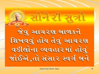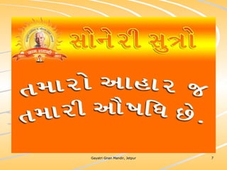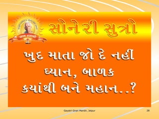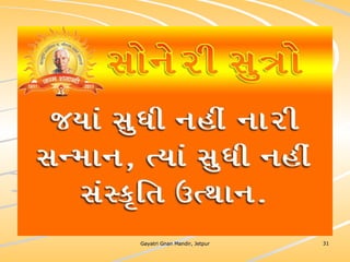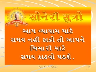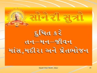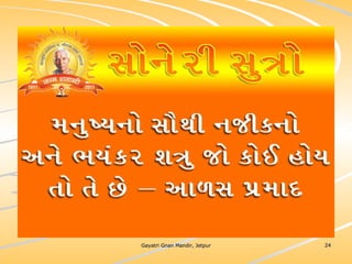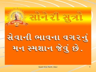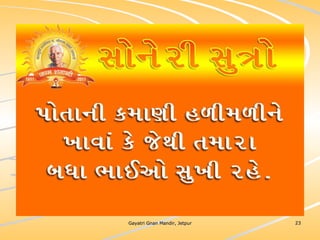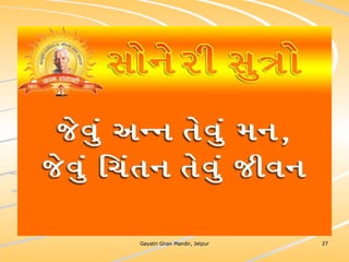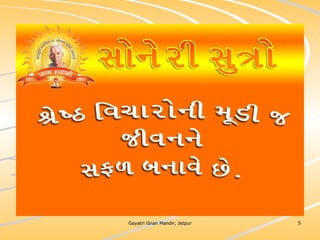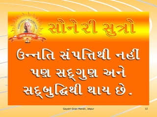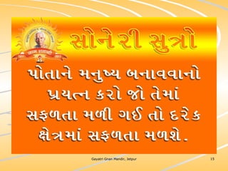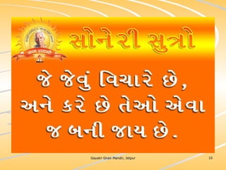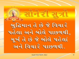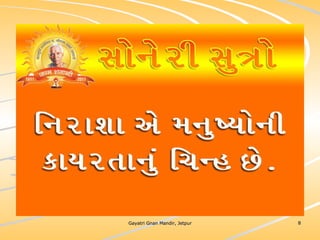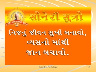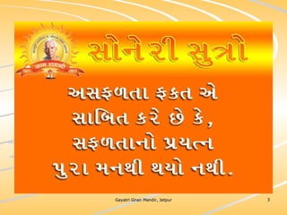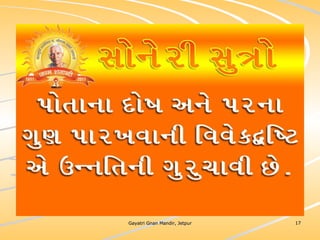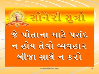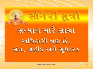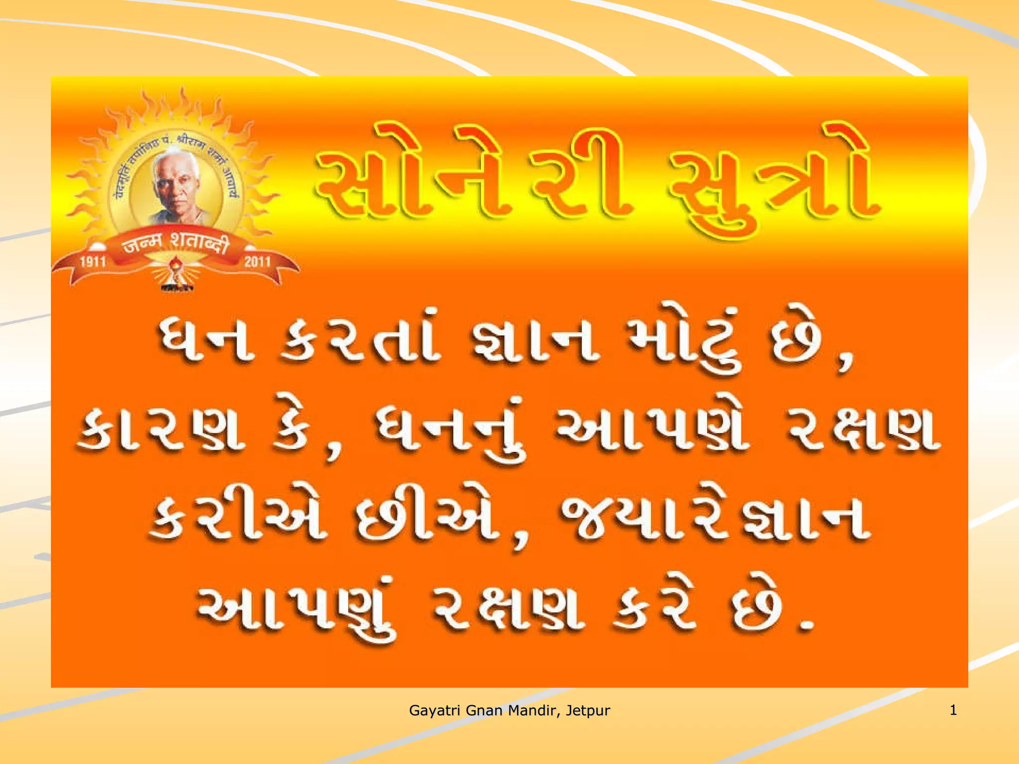 ધર્મ અધ્યાત્મનું સાચુ સ્વરૂપ, નૈતિકતાના ધોરણે મનોબળ કે નિષ્ઠાનો વધારો અને સામાજિક કુરિવાજો પ્રત્યે અસહયોગ આંદોલન જગાવવાઅ ધર્મ સંપ્રદાય નિરપેક્ષ સદ્દવાકયોનો સંગ્રહ.... સોનેરી સુત્રો